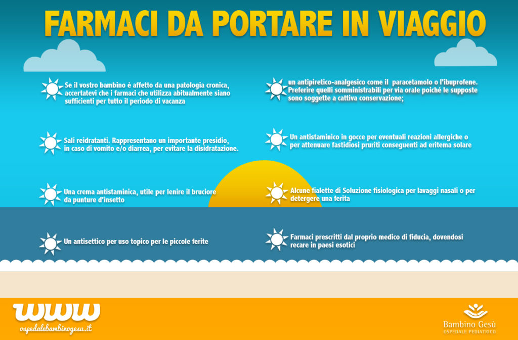 Se il vostro bambino soffre di una patologia cronica o sta seguendo una cura che non potete interrompere assicuratevi di avere con voi dosi sufficienti di farmaco per tutta la durata della vacanza. Secondo il vademecum dell’Ospedale Bambin Gesù, al quale ci riferiamo per questi suggerimenti, sarebbe preferibile portare in valigia anche altri presidi sanitari come un prodotto a base di ammoniaca per le irritazioni causate dalle meduse, cerotti e garze, repellenti per zanzare, una crema solare ad elevata protezione, un termometro, una zanzariera da applicare sulla culla del bambino, una crema reidratante per eventuali eritemi solari, i prodotti necessari per l’alimentazione di un lattante se non li doveste trovare sul posto.