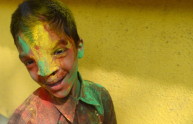 A physically challenged Indian child smeared with gulal-coloured powder smiles during Holi celebrations at a special school – Society for the Edcuation of the Crippled, in Mumbai on March 26, 2013. Bollywood stars have joined calls for Mumbai to temper celebrations and reduce water wastage during a riotous Hindu festival this week, as millions of Indians face their worst drought in decades. ‘Holi’, the festival of colours, is a riotous celebration of the coming of spring and falls on the day after full moon annually in March. Revellers spray coloured powder and water on each other with great gusto, whilst adults extend the hand of peace. AFP PHOTO/ INDRANIL MUKHERJEE (Photo credit should read INDRANIL MUKHERJEE/AFP/Getty Images)