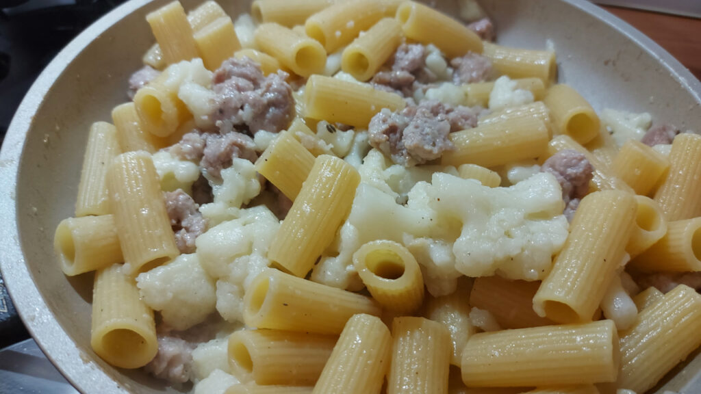 Primo dal sapore invernale, pasta con crema di cavolfiore e salsiccia