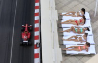 Women sunbath as Ferrari’s Brazilian driver Felipe Massa drives past during the third practice session at the Circuit de Monaco in Monte Carlo on May 25, 2013 ahead of the Monaco Formula One Grand Prix. AFP PHOTO / ALEXANDER KLEIN (Photo credit should read ALEXANDER KLEIN/AFP/Getty Images)